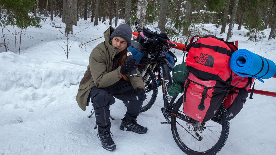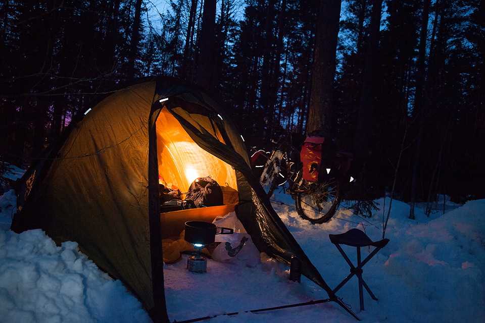 Camping in the thick snow here is another new experience for me. I realized the tent pegs are totally useless here camping in the snow. The only solution is to cut some tree branches and use it to hold my tent instead. Luckily, my new tent by Hillberg is super easy to setup. It only took me 3 minutes to setup the 2 person tent. The hard part was to dig the deep snow. I need a shovel to make it easier for me to do that. It took forever to dig the snow with my legs… and its very tiring! I’m still not used to all these and I still get a lot of sweat from cycling, which made me struggle of the cold everynight. The sweat will never get dry and the cold is hitting me all the way to the bones! Everything is slower in the cold. Boiling hot water took double the time compared to normal condition. Even to tie my shoe lace took forever, the shoe lace was frozen in the morning like a cardboard and my fingers move slower when frozen. Another problem I had was the bad ventilation inside my tent. It was really nice and warm inside my sleeping bag, making me to feel comfortable sleeping at night. The problem came the next morning, after hours of sleeping inside the tent, my tent got warmed due to my body warmth while outside was really cold. My tent then became wet and finally it all turned into ice and frozen solid! It was hell, took me some 5 minutes and a lot of motivation just to get out of my sleeping bag to the cold.