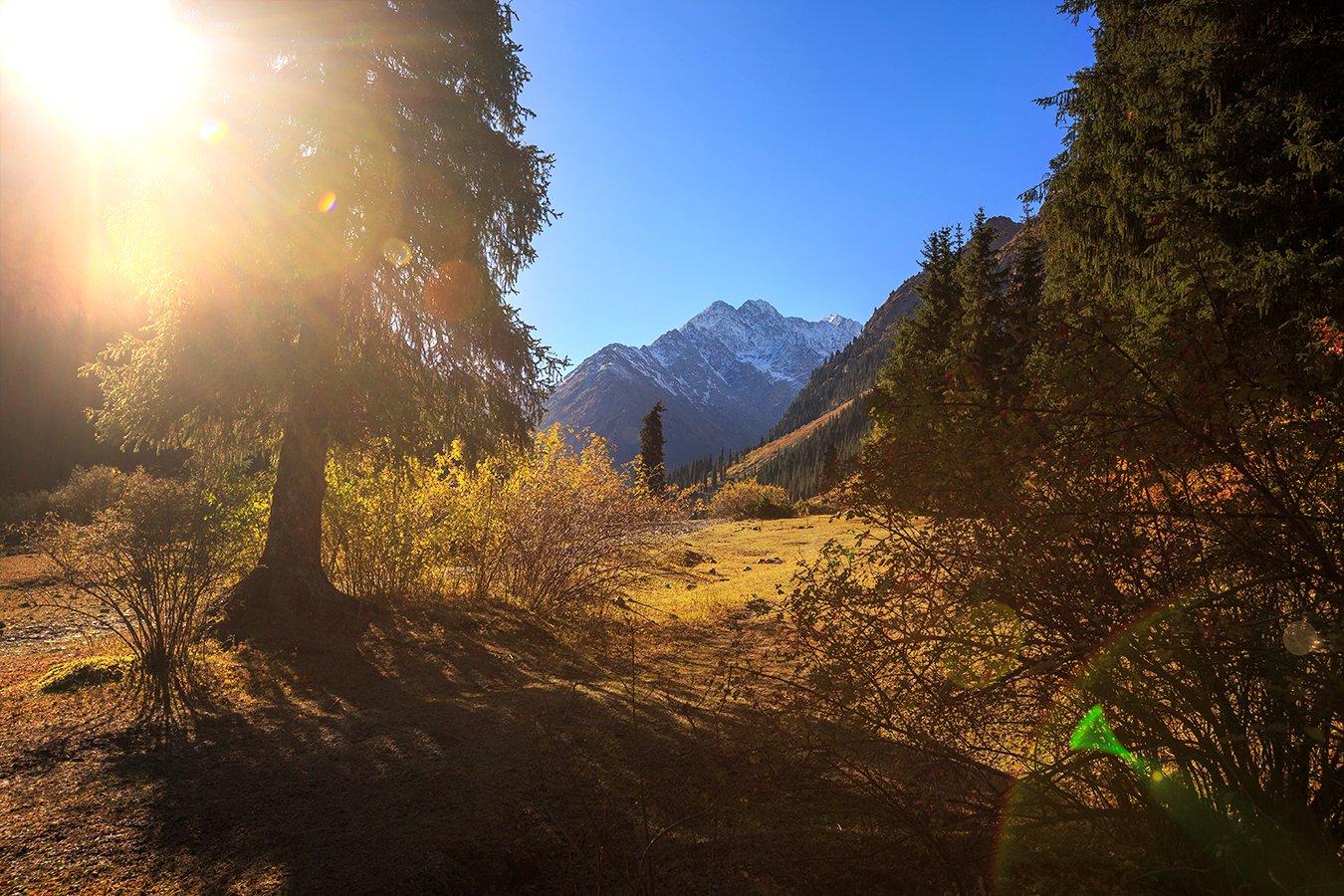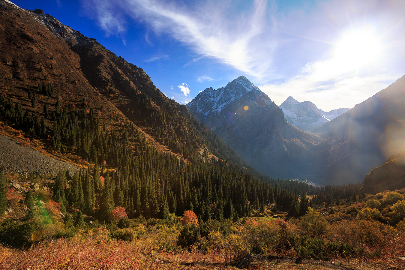 We stayed in a very nice guesthouse with a beautiful garden and great location at the corner of the town… a quiet place by the river. There is a great view of the mountains when you look at the direction of where the sun rises. The guesthouse we stayed is almost like the house that I ever dream to live. With beautiful garden, quiet, great views of the mountains and near a very small town… small enough for me to walk from end to end, without having a need to drive. We waited a day until the weather become sunny again to trek into the Alakol Lake since it was cloudy the day we arrived. The three of us then hired a Russian jeep to get us to the foot of the mountain, before we start trekking from some 2500m altitude climbing all the way into some 4000m altitude. We started trekking when the morning light started shining, giving its beautiful light through the colourful landscape of the Tien Shan mountains.