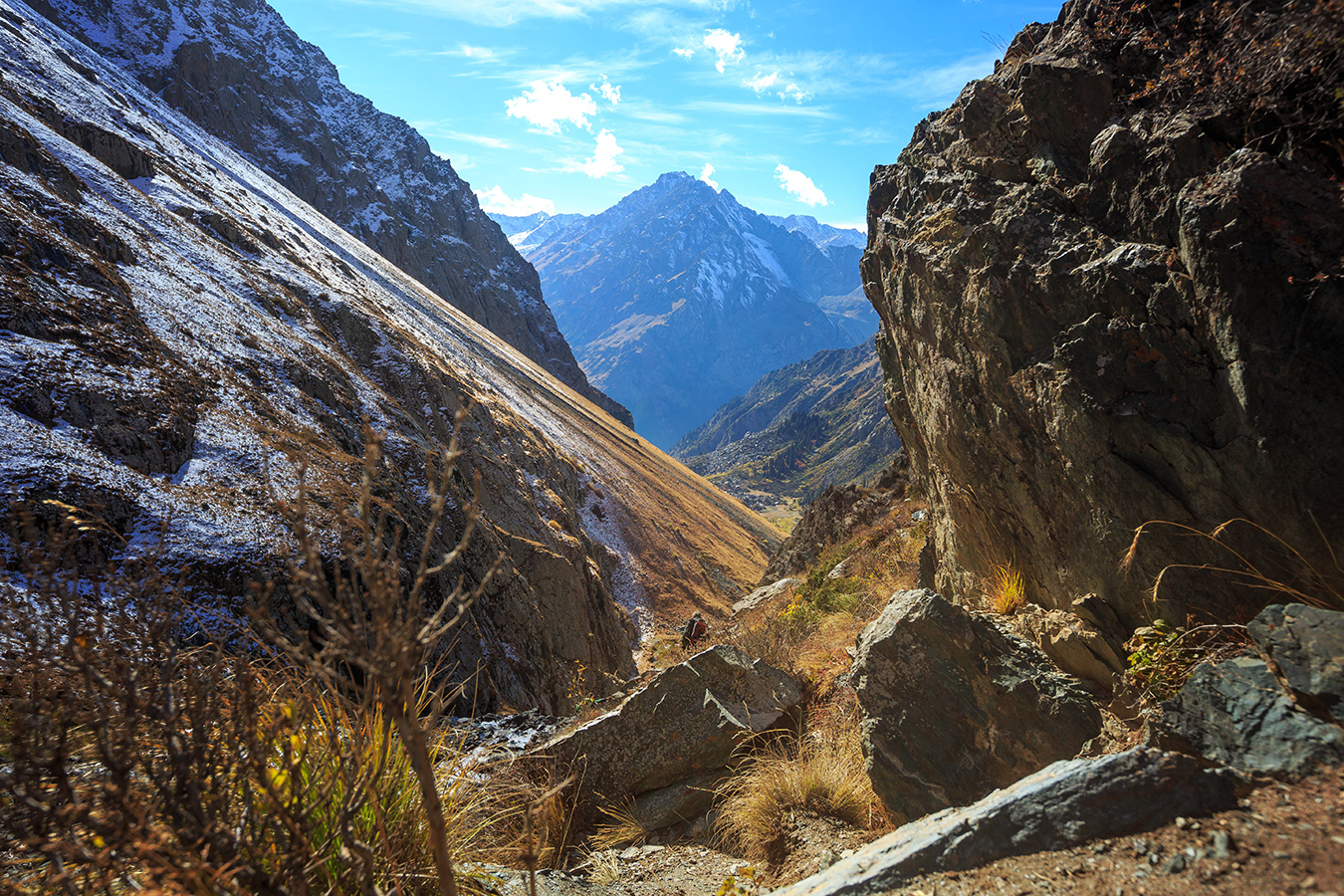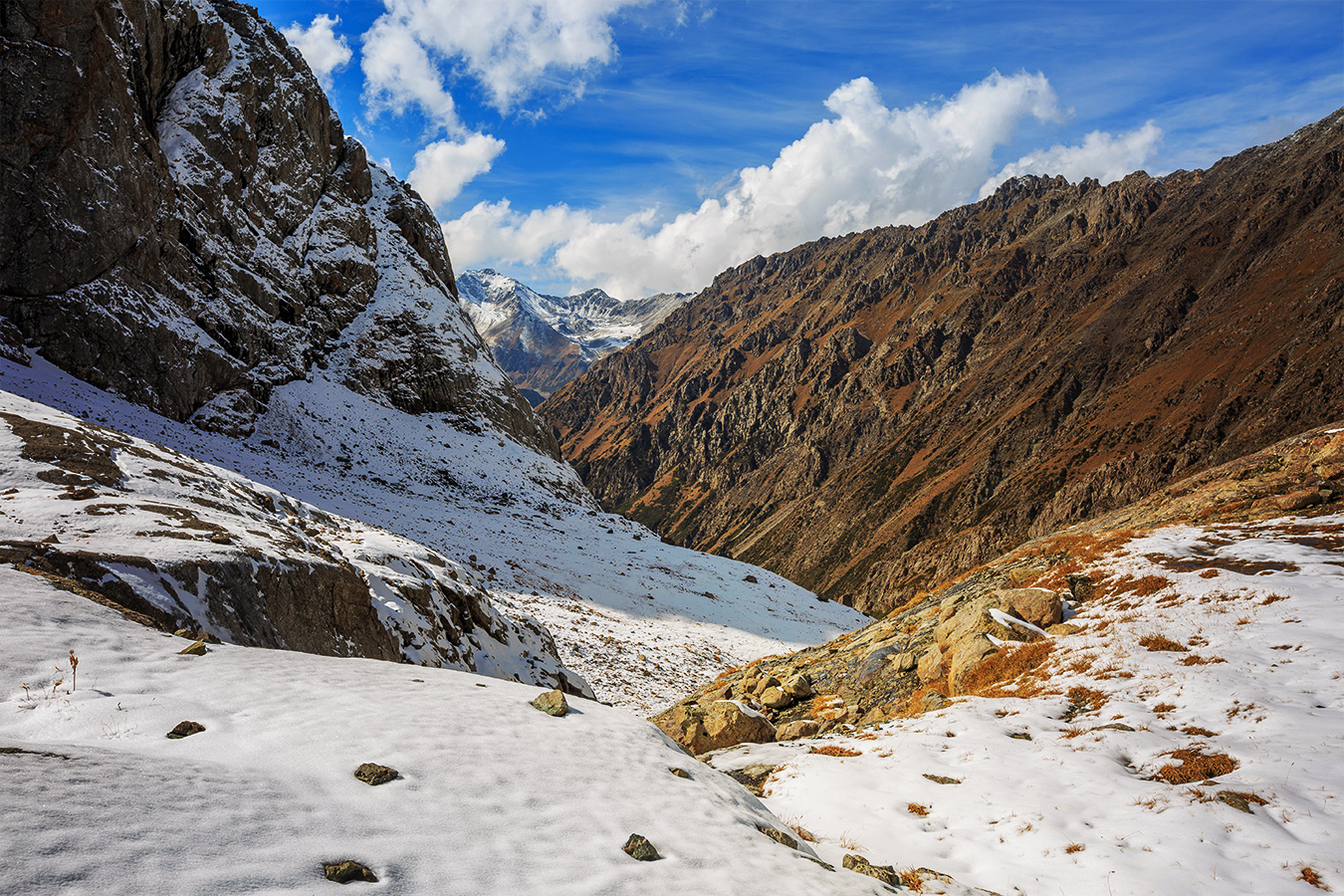 Once we reached some 3000m altitude, the landscapes totally changed into rocks and snow. It got steeper and quite dangerous, since none of us were carrying any mountaineering equipment. We felt stupid at this point, not preparing ourselves. It feels like we were doing some crazy winter adventure in the Arctic by just wearing tshirt. It was slippery climbing through fields of melting snow without crampons, proper mountaineering boot, gloves, walking stick etc… we were basically naked… completely nothing.