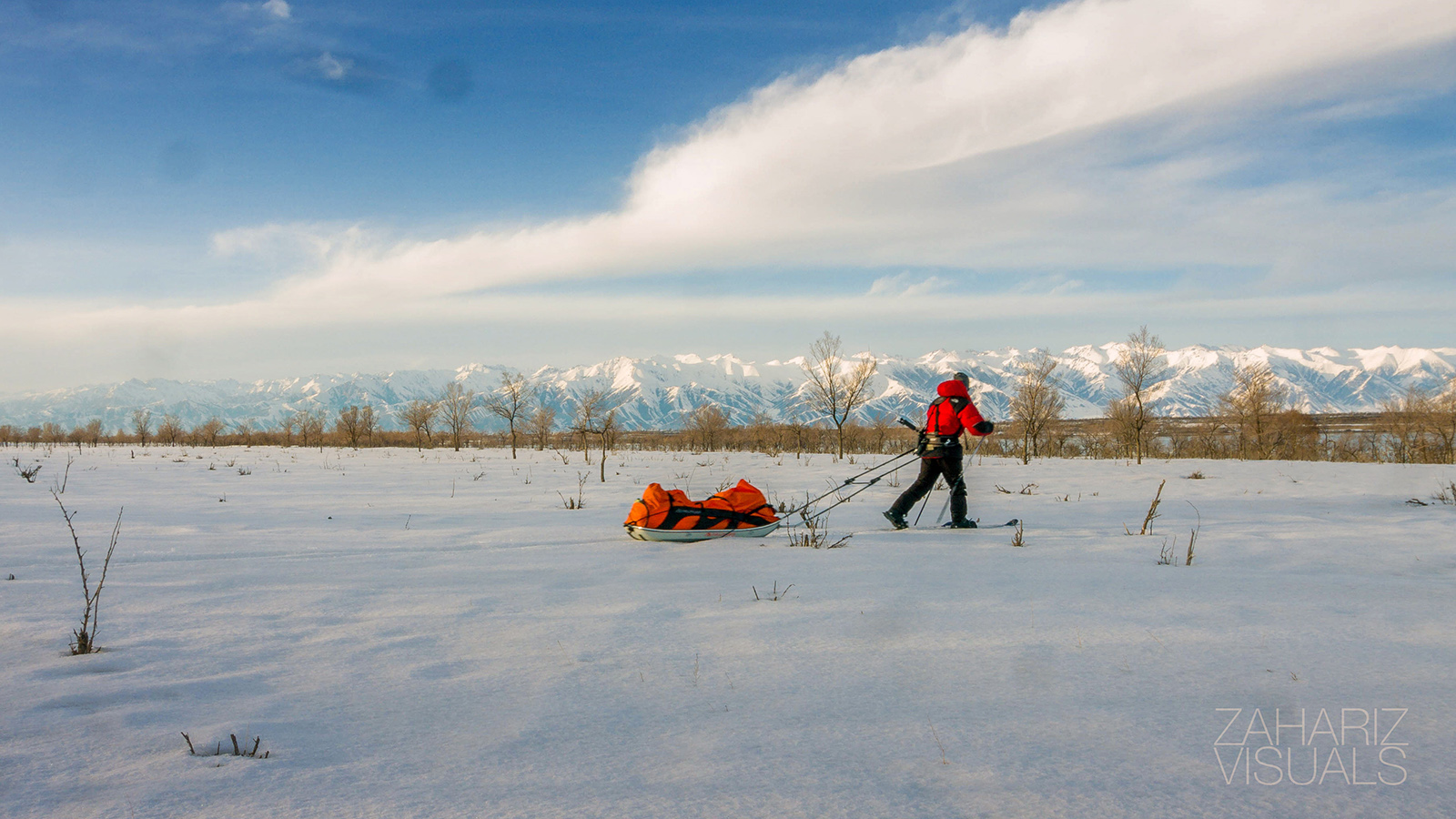 I continue my life as usual here in Kyrgyzstan, travelling at a slower phase on my ski pulling my belongings, descending from the mountains towards the eastern shore of Issykkul Lake. Travelling on a short and broad forest ski that I got from the Finns is much slower and more tedious compared to riding a bicycle. The energy I used to pull my sledge on a ski for a kilometer is probably the same energy I cycled pulling 50kg of luggage for 10 kilometers. I’m happy to cover at least 15km a day here in the Tien Shan mountains. I’m travelling probably a little faster than the speed walking, sliding through the thick snow, embracing the cold thin air in the mountains that goes right to my lungs.lip3s
