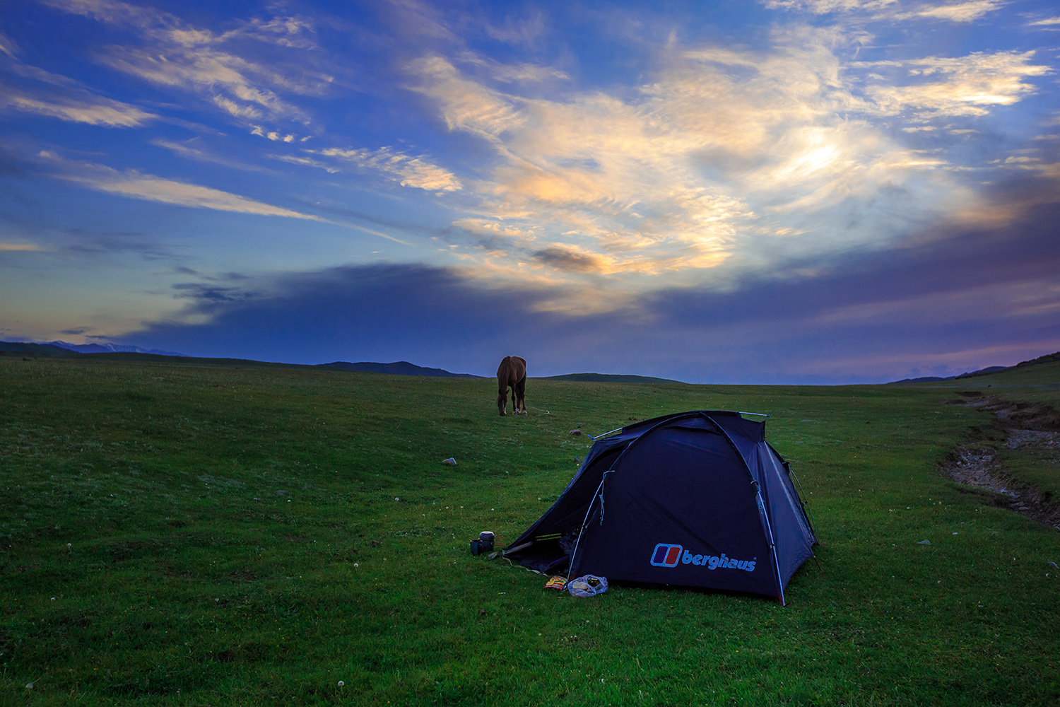 Travelling on horses through the Tien Shan is not as easy as I would imagine. I still remember pulling my skis in the same mountains during the winter time was much more difficult compared to travelling on bicycle. Travelling on horses however, is not as tiring but as Im filming my journey into a travel documentary, I could say that this is far worst compared to cycling or skiing. I had to untie my bag from the horse to get my camera and tripod out, tie the horses legs, set the camera, untie the horses, get back to the horse and start riding, come back to get the camera, tie the horses legs again, repack the camera bag, untie the horses legs and finally… I can keep going. My horses are strong and communicate well with me but theyre just not good actors. Its difficult to get them to walk on a specific path so that it will always stay inside the frame of my camera. And I can only do it on flat ground, there is no way I can film myself ascending or descending steep mountainside… except from my gopro camera that I attach on my head.