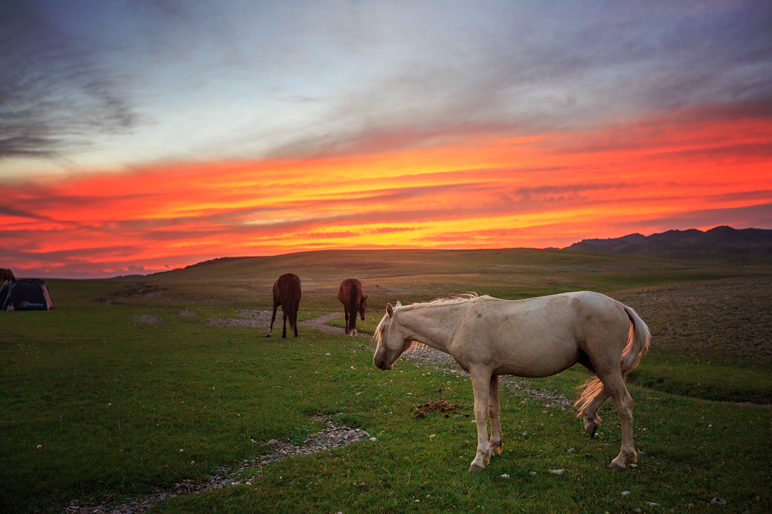 As I kept riding west through the Tien Shan range, I saw beautiful changes of landscape from dry tundra of the lower Tien Shan, to the high mountain pass and finally towards the vast endless grassland… all lit under the light of summer. I rode slowly, probably between 40-50km when I rode through grassland where I can gallop once in a while, or just about 25km a day when I had to cross mountainpass above 4000m. Once every few hours, I will usually pass by sherperds… taking their herds towards the higher ground to let them feast the fresh good grass. They are all over the mountains now, as the mountains provide them good grass and fresh water. And once in a while, I pulled the rope that is attached to the head of my horse gently, to stop the horse from moving… so that I can stand still to enjoy the breathtaking view… to really appreciating it to the fullest before it pass by to become nothing more than a memory.