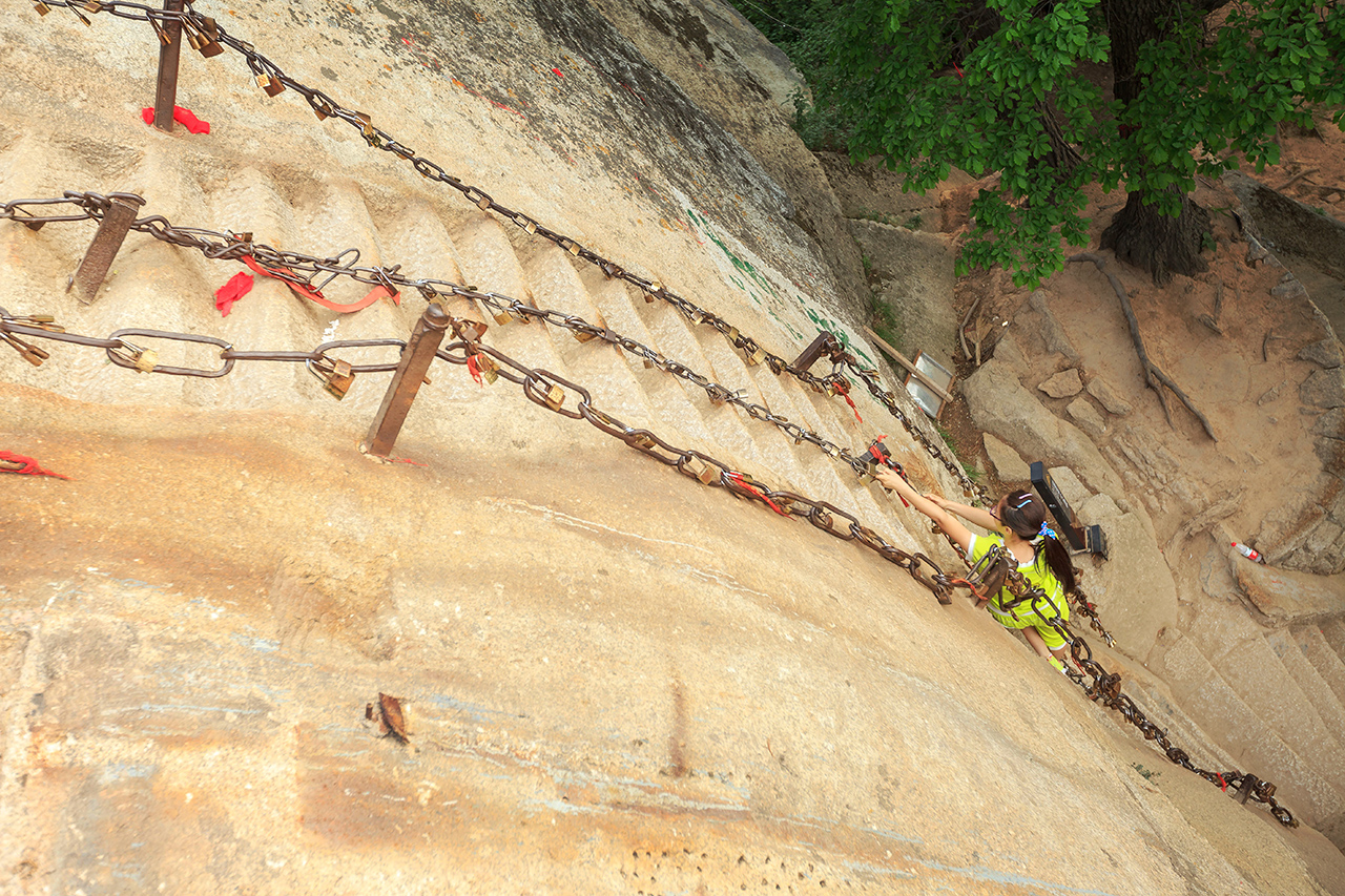 But I forgot one thing, this is China! And its totally the wrong timing! I went to the bus station in Xi’an to get to Hua Shan, and realized there were soooo many people queuing up to get to the bus there. Its holiday here in China! I had a bad feeling about it, but I went anyway. Upon reaching a small village, where it’s a starting point of the climb, I went straight for the climb, ignoring all the locals offering me some food and accommodation. I wanted to do the toughest route to get to the north peak but couldn’t find it. I only found the stairs to get to the north peak of the mountain, which is still quite hard work anyway. I arrived the mountain quite late at around 5pm, and they say usually it takes about 11 hours of hard work climb to cover the full circuit. But I went late since I was confidence that I don’t need 11 hours to cover the whole thing, and it took me only 4 hours to cover the whole full circuit. I guess fighting the wind in the Mongolian steppe and the Gobi Desert has prepared me well for this kind of climb. The first few kilometers to get to the north peak from the base is quite easy. But the last 30 minutes was tough. The stairs were really steep and I got nervous at some point since it was really steep and very high. “Whatever you do, don’t look down”, I reminded myself. Right after I said that to myself, I looked down! Hehe… and it was quite scary.