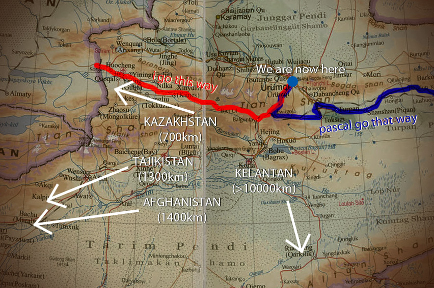 Im stucked here in the city for almost 2 weeks already i guess, while waiting for my Kazakhstan visa. Uhh.. took them a week to get my visa done… blehhh… Hopefully will get it by tomorrow and on tuesday i can start riding again to the mountains, away from civilization! Been spending most of my time with pascal and bruno these last few days, pascal treated me for dinner on my birthday :) Well, the most interesting thing happened lately? was that i managed to convince pascal to cycle!! At first, it was just a normal conversation, i was telling him my cycling stories, he got inspired, looking at my blog, and suddenly he told me.. why dont he do the same. The next day, he then asked me to company him to a bikeshop near our hostel. And the next day, he decided to get one! Hmmm… 3 days to convinced him to get on bike. Now, he decided to ride from Urumqi to Xi’an, take train to Kunming in downsouth, then cycle again to vietnam, then cambodia, laos, thailand and malaysia! Hehe… he is now my 2nd apprentice, after Nancy :) Taught him many things about traveling by bike, what to take and what not to take and so on. Told him dont worry about not getting the most expensive bike from the shelves, since i met a crazy italian guy riding from beijing to lhasa with a single speed bike! He then bought a quite good giant bike, 2600 yuan (similar to our 1300 ringgit) and all the necessary equipment, and soon will be ready to rock the road, just like me :)