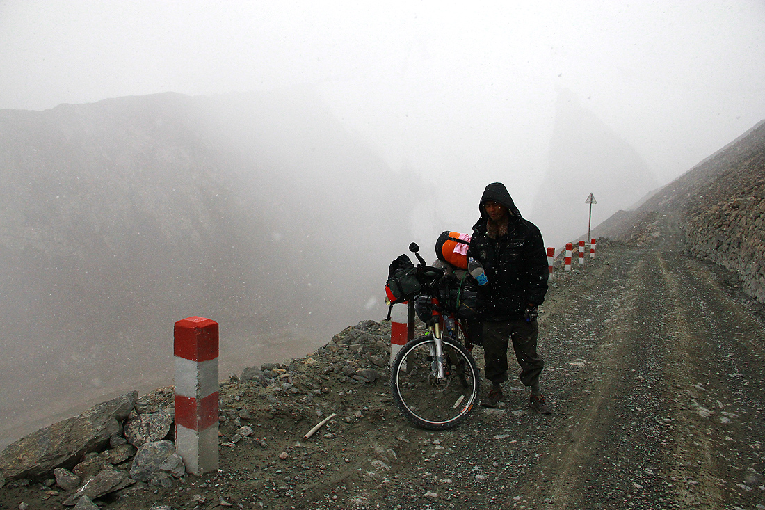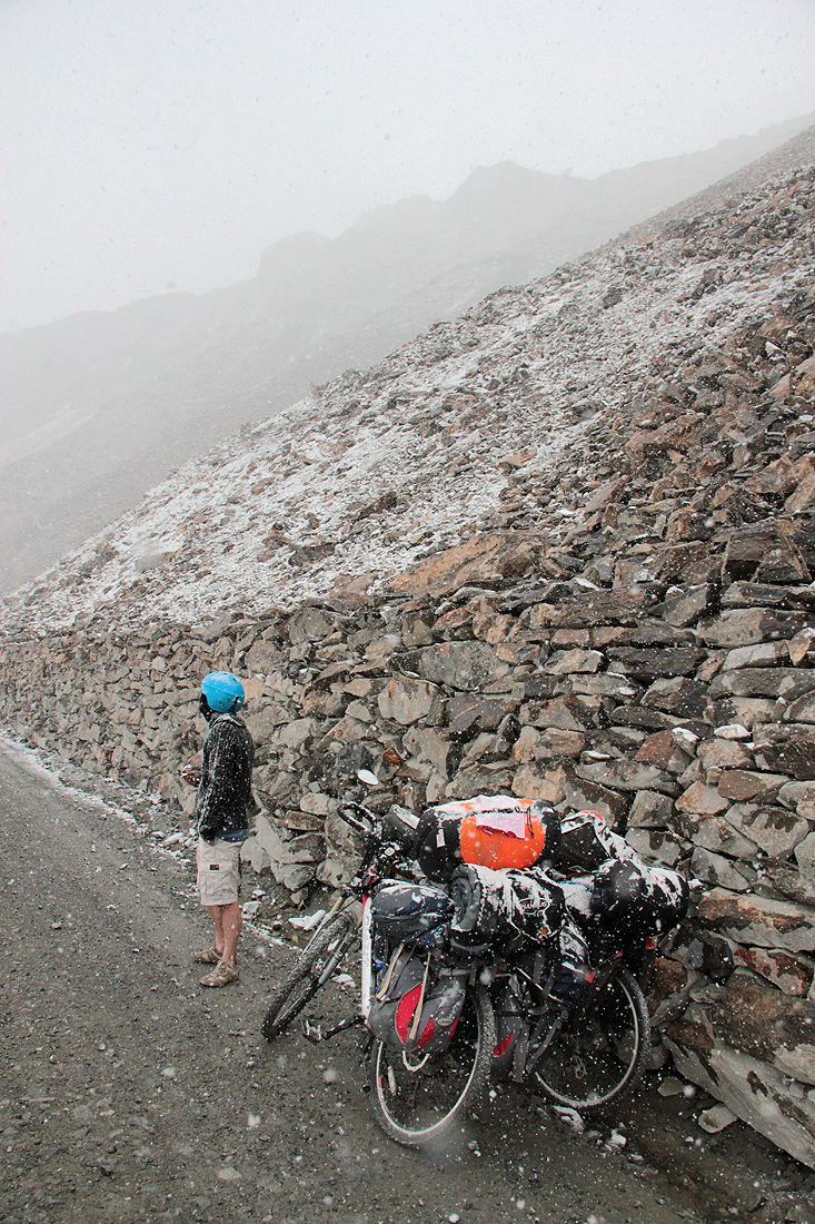 It was weird today. At first it was sunny, then the evil looking clouds started coming in. It is the end of summer now but it was snowing! It was actually a heavy snowstorm when we were climbing, which makes it harder to climb to the top. We were freezing at about -5 celcius. We didnt expect this and Pascal was wearing short pants haha. Pascal was so afraid at 1 point and said this snowstorm could be very dangerous but i calmed him down. We rode to the top successfully anyway. It was around 6 pm when we reached the top but we didnt stay long, since it was way too cold for the both of us. After done snapping photos with some other chinese tourists at the top, we quickly rode down.