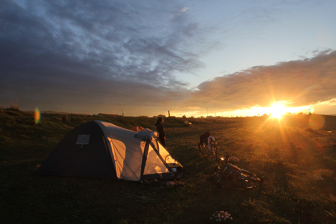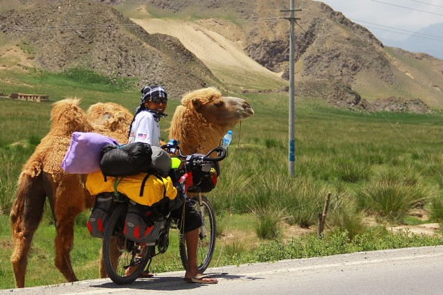 We stopped cycling at around 6.30pm as we found a good place to camp. We then setup our tents, ate dinner and enjoyed coffee together while waiting for the sunset. Nancy then took a nap as she was tired and i sat outside my tent enjoying the magnificent view of the sunset in the desert. I felt so good and peaceful. Listening to my ipod while watching the incredible view with my own 2 eyes, Im really living my dream now. Far away from the tension city life, far from the noise of the heavy traffic back in KL, far from pollution and the acidic rain. I then woke Nancy up, to let her enjoy the sunset view too. She then went back to her tent to sleep early, while me writing this blog inside my tent. Tomorrow is another easy ride to Delingha, maybe some 30km away from here, as my meter computer isnt working now.Another 76km of ride today, and that put us in a small nice peaceful town called Wulan. The ride today was easy, very easy, flatland and some downhill, and now in Wulan, we are down to 2905m altitude, down from 3060 back in Chaka. Only thing that slowed us down was, the wind was blowing against us. We rode along some very beautiful views. Slowly, the landscape changed from high mountains to a dry desert. We also felt the difference on the weather, from very cold temperature of Qinghai Lake to very hot Qaidam Basin. I came across the first camel on my ride today since im in China. Its a sign, that im approaching the Taklimakan Desert. Soon ill be riding along The Ancient Silk Road!